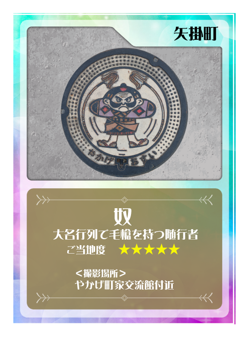 中でも矢掛町の歴史と伝統を象徴している【奴】のマンホールをご存じでしょうか?奴とは、毎年開催される『矢掛の宿場まつり 大名行列』で登場する毛槍(けやり)を持ったお供のことで、町の名物です。