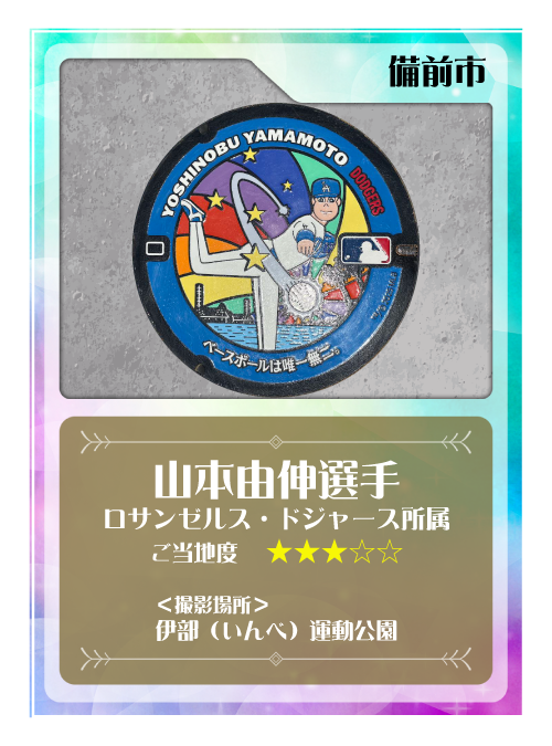 MLBがリーグで活躍する日本人選手12人の一人、備前市出身の山本由伸投手をたたえるために制作したマンホールの蓋が、ゆかりの地に設置されています。近くにはQRコードが表示されていて、読み取ると山本投手の動画が楽しめます。